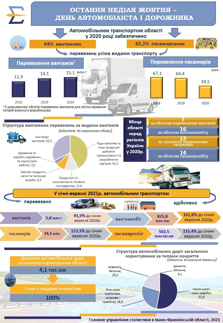 Автомобільний транспорт є наймасовішим та найдоступнішим засобом пересування. В області автотранспортними засобами здійснюється більш як 60% вантажних та 80% пасажирських перевезень усіма видами транспорту. Найбільш потужними перевізниками на ринку автотранспортних вантажних перевезень виступають товариства з обмеженою відповідальністю «Європатрансагро», «БМУ-77», «Управління механізації «Рада», приватні підприємства «Бетуртранс», «Прикарпатбудтранс». Серед пасажирських автоперевізників найбільш значні обсяги перевезень здійснюють комунальне підприємство «Електроавтотранс», товариства з обмеженою відповідальністю «Приватавтотранс», «Коломийське АТП», «Люкстранс». За 2020 рік автоперевізниками області (юридичними та фізичними особами–підприємцями) перевезено 15,1 млн.т вантажів (з урахуванням обсягів перевезень вантажів для обслуговування потреб власного виробництва) та виконано транспортну роботу в обсязі 1,5 млрд.ткм, що у порівнянні з попереднім роком більше відповідно на 7,3% та на 2,3%. Більшу частку (85,6%) у загальному обсязі комерційних вантажоперевезень області складають автоперевізники-підприємства (юридичні особи). Серед видів вантажів, які перевозили автотранспортні підприємства у 2020 році, провідну позицію займали камінь, пісок, гравій, глина, торф та інша продукція добувної промисловості та розроблення кар’єрів (40,6% загального обсягу вантажних перевезень підприємств), зернові (12,4%), харчові продукти, напої та тютюнові (8,5%). За обсягами вантажних перевезень за 2020 рік область посіла 7 місце серед регіонів України. Послугами автомобільного транспорту (з урахуванням перевезень транспортом фізичних осіб-підприємців) за 2020 рік скористались 39,5 млн. пасажирів, що в 1,6 раза менше, ніж у 2019 році. Пасажирообіг, виконаний автомобільним транспортом, у порівнянні з попереднім роком зменшився у 1,7 раза і склав 607,5 млн.пас.км. Більшість пасажирів (61%) перевезено на маршрутах у внутрішньоміському сполученні, 32% – у приміському, 7% – у міжміському. За обсягами пасажирських перевезень серед регіонів України за 2020 рік область посіла 13 місце. Мережа автомобільних доріг загального користування області становить 4,1 тис.км доріг з твердим покриттям, що у розрахунку на 1000 квадратних кілометрів території складає 296 км. За типами покриття доріг в області переважає чорне шосе і чорні гравійні дороги (понад 53% від загальної протяжності доріг) та дороги з асфальтобетонним покриттям
